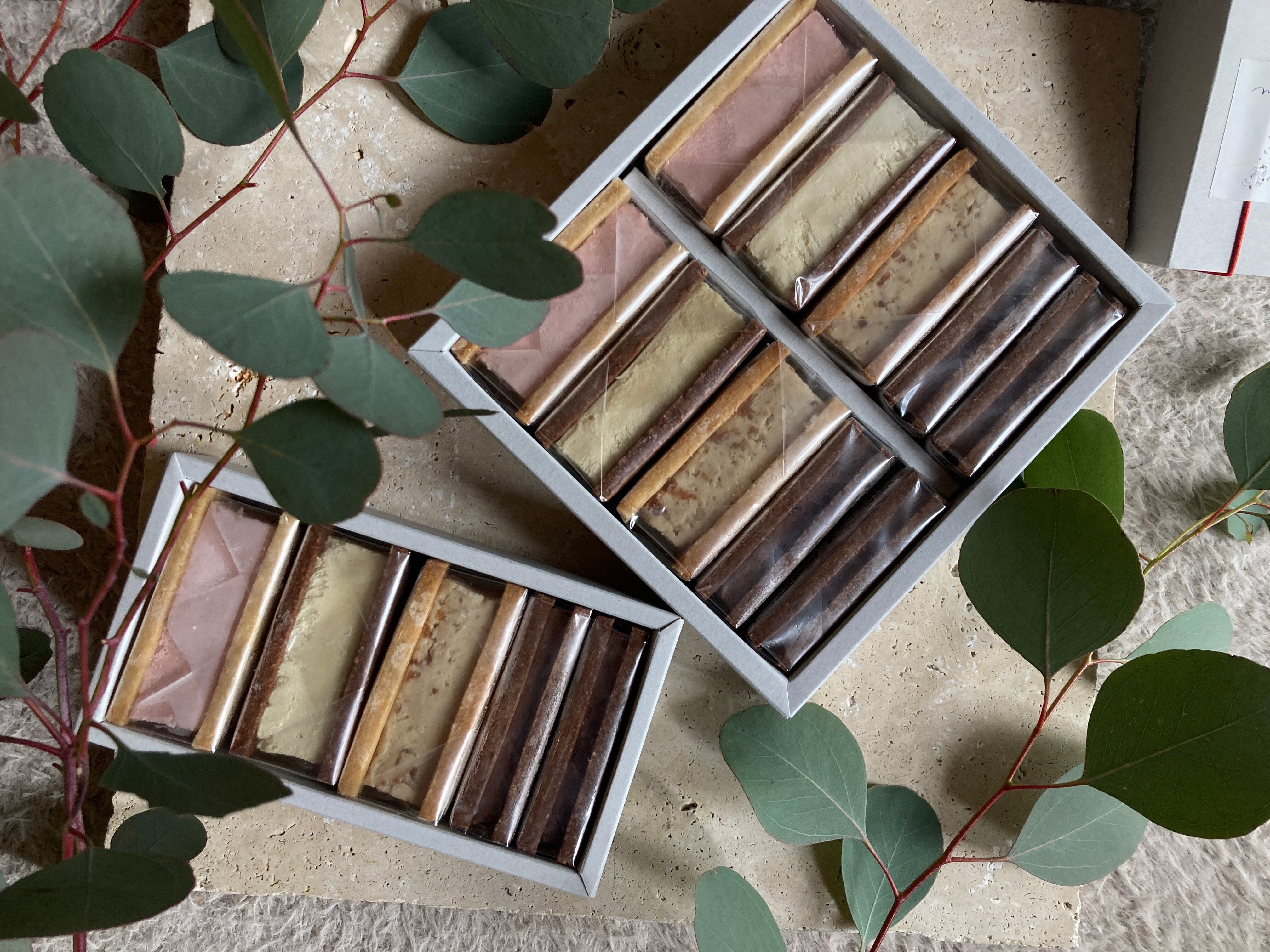 米粉、アーモンドプードル、メープルシロップ、片栗粉、ココナッツオイル、菜種油、カカオバター、アーモンドバター、カカオパウダー、カシューナッツ、イチゴ、八朔、レモン汁、レーズン、ラム酒、バニラエクストラクト、塩